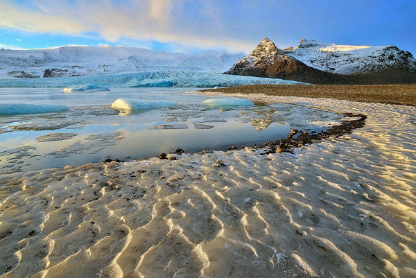 Het kleine ijsmeer Fjallsárlón staat vandaag op het programma. Dit ijsmeer is iets kleiner dan Jökulsárlón maar de aangrenzende gletsjer, genaamd Fjallsjökull, ligt daardoor ook wat dichterbij waardoor je er makkelijker detailfoto’s van kunt maken. De ijsbergen die in het meer drijven liggen regelmatig ook dichterbij de waterrand waardoor je ze goed kunt gebruiken in je compositie. Soms vriest dit ijsmeer ook helemaal dicht in de winter waardoor de ijsbergen vast komen te liggen en je er zelfs omheen kunt lopen en ze vanuit verschillende hoeken kan fotograferen. Uiteraard doen we dit alleen als het volledig veilig is. In onze ogen is Fjallsárlón een ware toplocatie voor de landschapsfotograaf en zullen hier dan ook ruim de tijd nemen voor een goede fotosessie. Het laatste licht kunnen we meepakken bij het eerder bezochte Diamond beach om daar nog eens aan de slag te gaan met verschillende sluitertijden. In de avond wellicht een groen spektakel in de lucht?